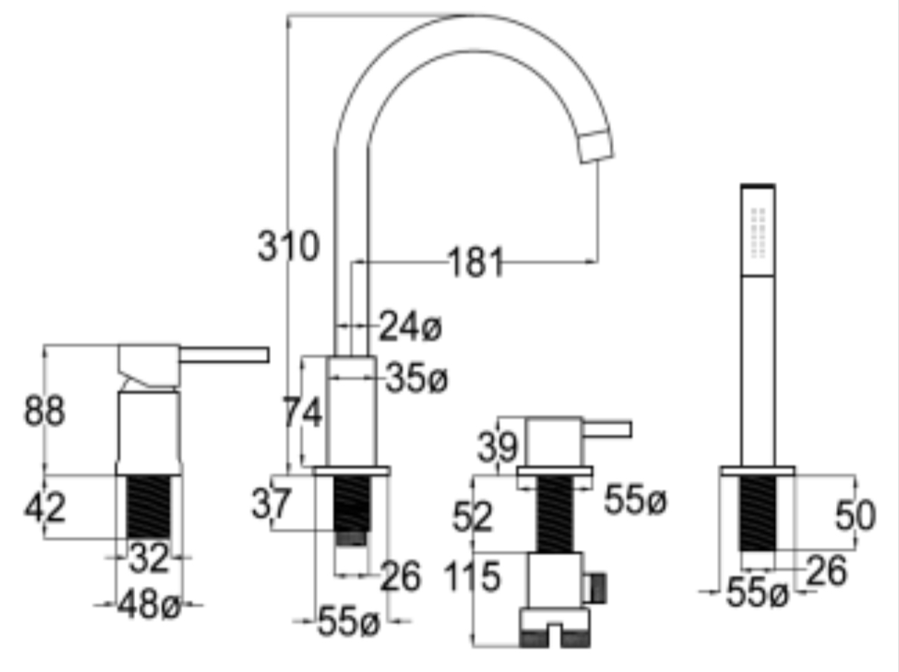 - 4 Holes bath mixer with hand shower